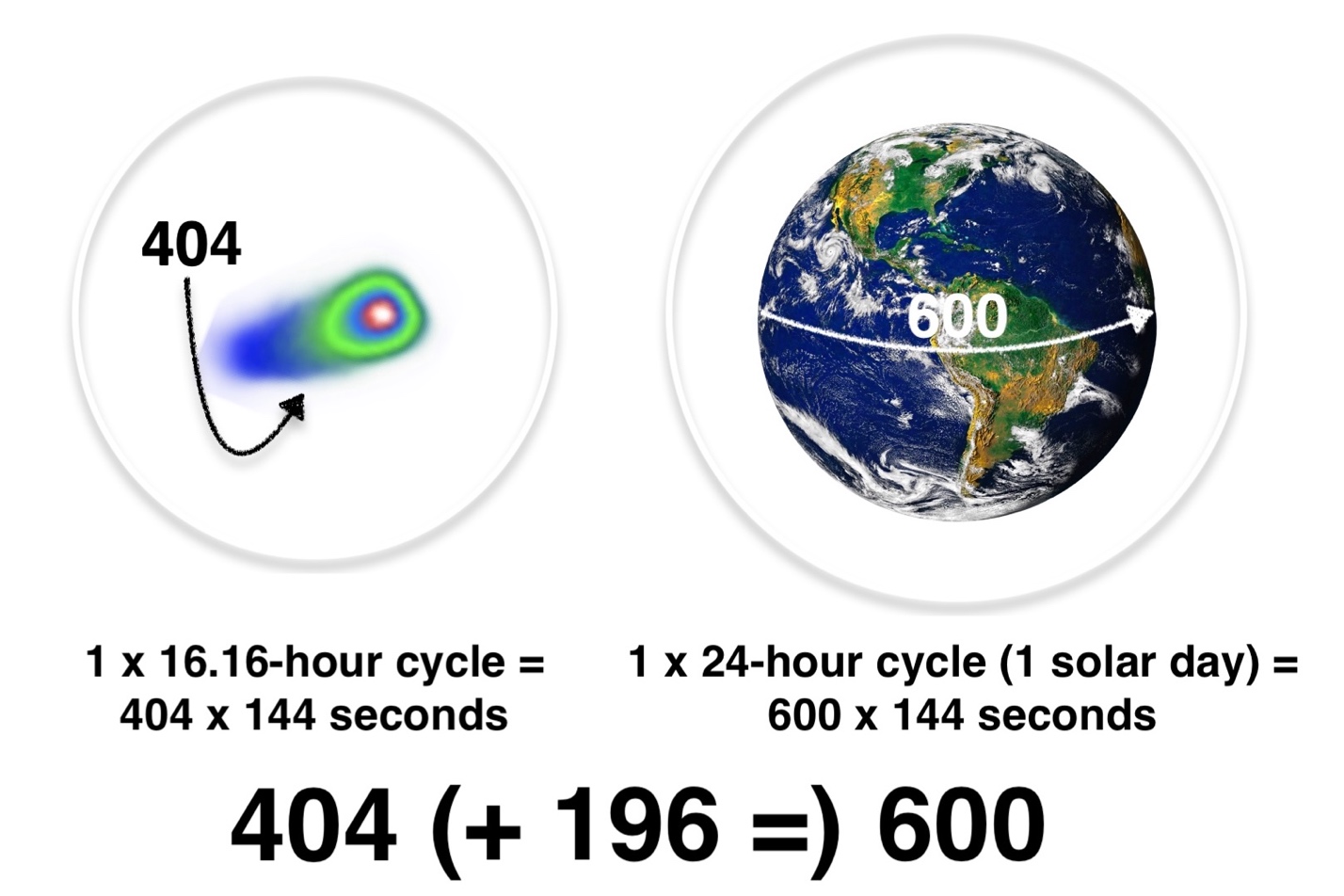 The Earth’s daily rotation across the course of 24 hours is 600 of these same 144-second units of time measurement (i.e., 600 x 144 seconds = 86,400 seconds, that is 1440 minutes or 24 hours).