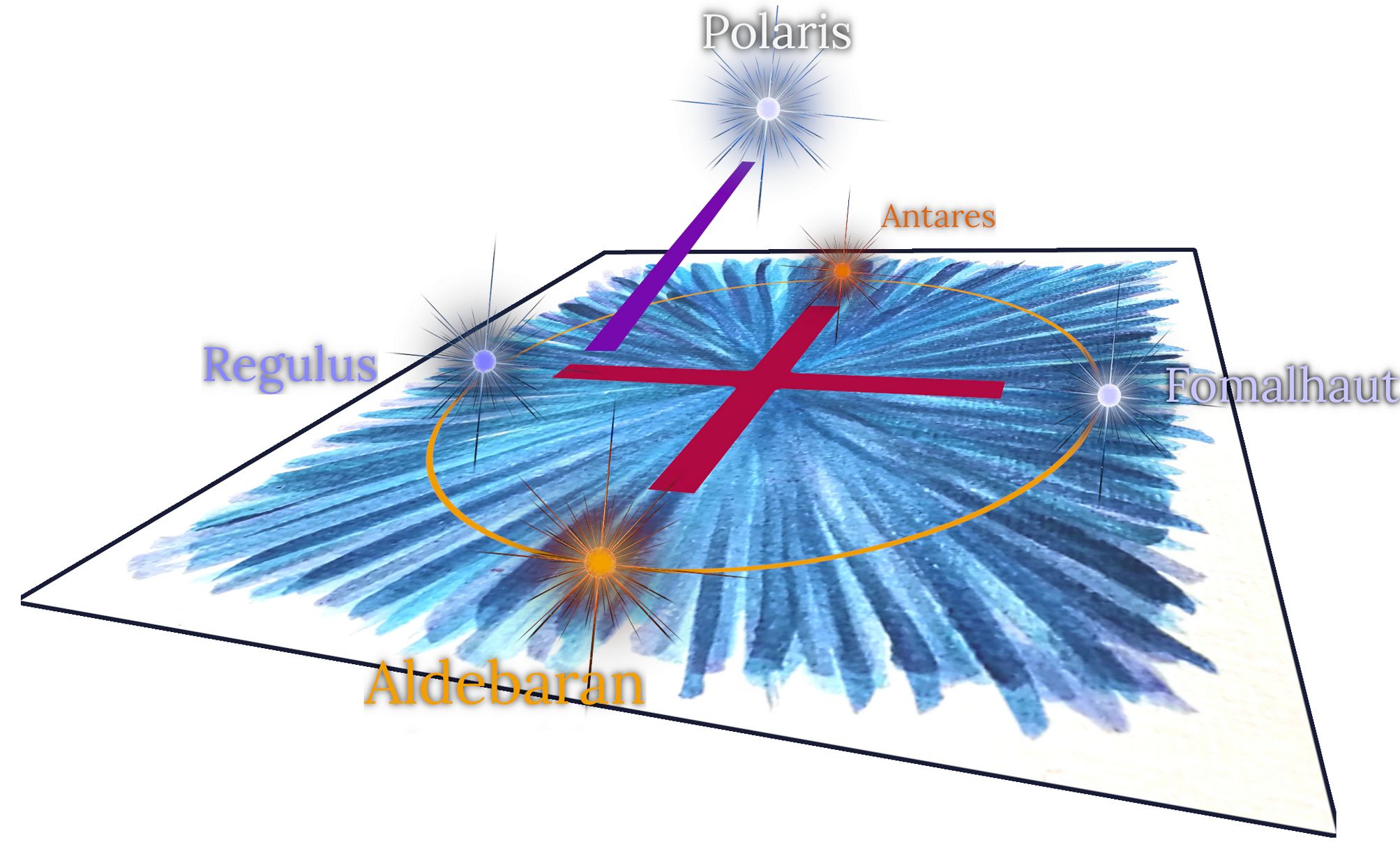 My breakthrough was the number four, pedwar. Having determined the sign for Earth placed the observer at the centre of Earthly cardinal directions, with the external ring being the celestial equator, I realised that the number 4 demonstrated the same perspective. The cross represents the cardinal directions, each occupied by one of the four exceptionally bright, eternally still, equally spaced, Royal stars…