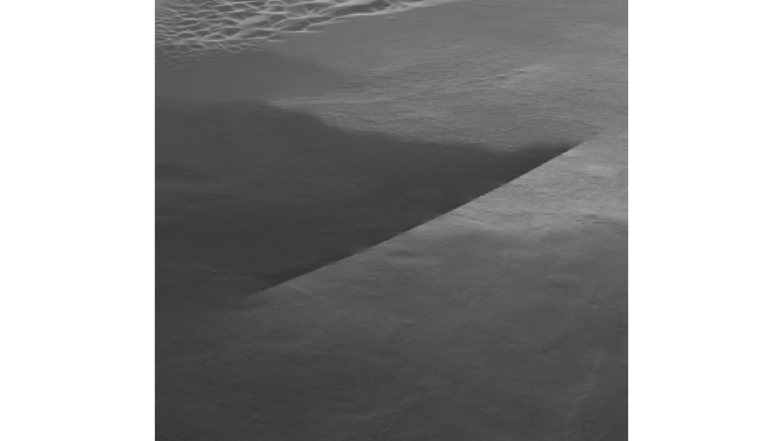 Photo 7: Pyramid beside the crater. Height 990 meters. Base 90 meters x 4. Extremely tall, appears to have four equal sides. (Courtesy of JPL and NASA)