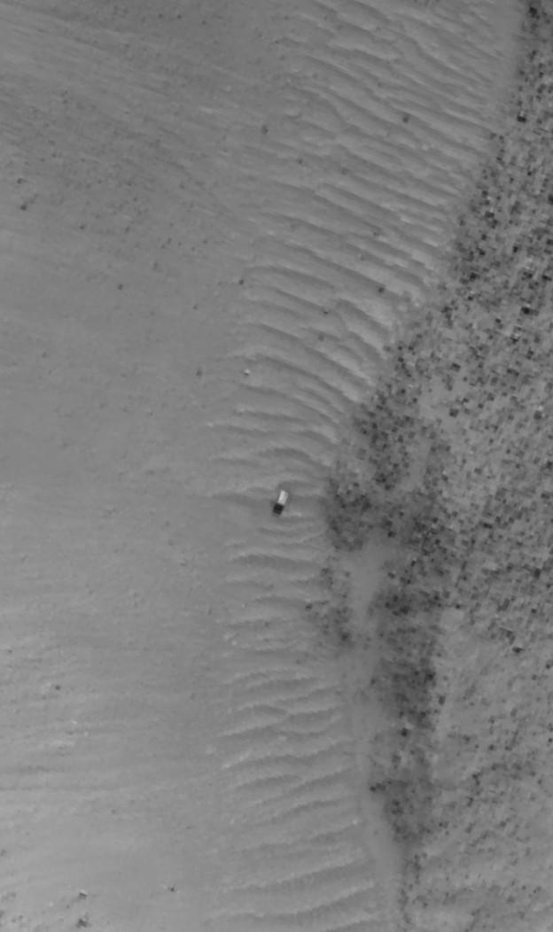 Photo 5: The structure is the white object at the bottom left. One side is 6 meters, the other 7.6 meters. (Courtesy of JPL and NASA)